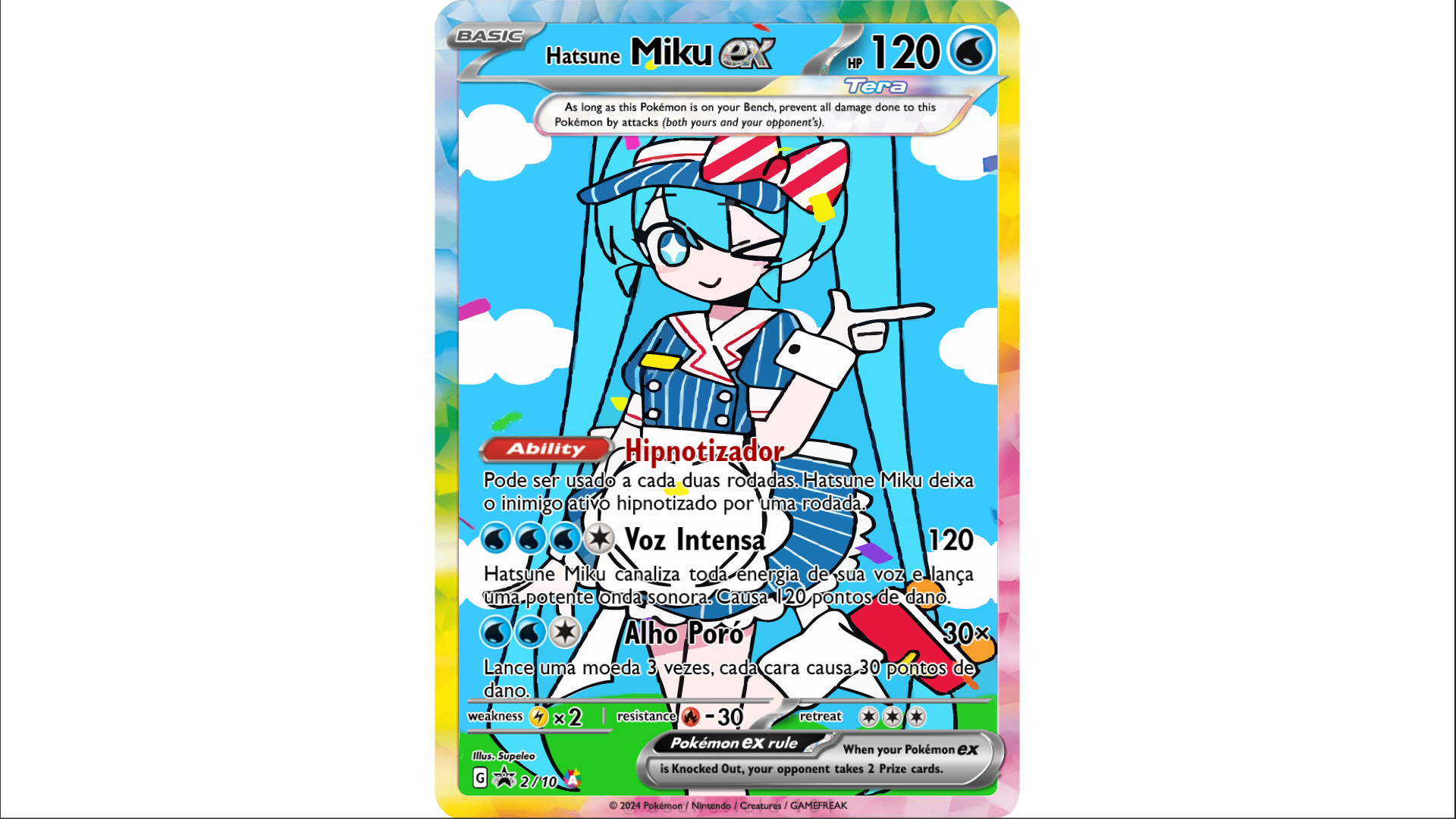 Usado no Paulo Freire desse ano, cada aluno tinha que usar um personagem existente como identidade visual ou criar o seu próprio, como eu não sei desenhar, misturei a vocaloid Hatsune Miku e cartas de Pokémon para criar minha identidade.
