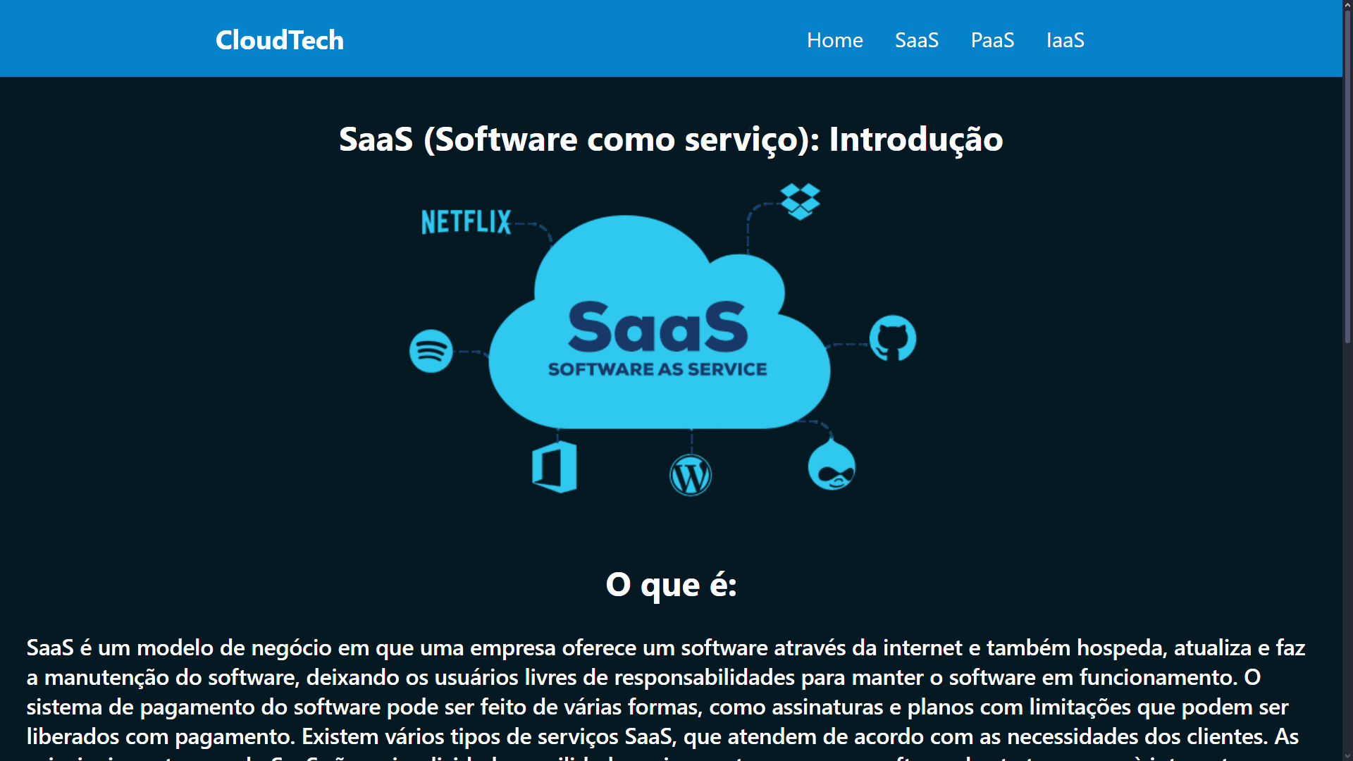 Esse site foi um site criado para apresentar uma pesquisa sobre modelos deserviços de computação em nuvem, é responsivo, porém básico. Melhorei um pouco das minhas habilidadesem CSS, como animação de texto. Também não foi usado JS.